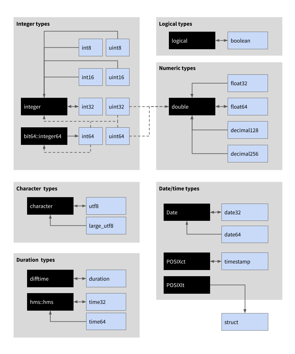 Some of these differences are purely cosmetic: integers in R are in fact 32 bit signed integers, so the underlying data types in Arrow and R are direct analogs of one another. In other cases the differences are purely about the implementation: Arrow and R have different ways to store a vector of strings, but at a high level of abstraction the R character type and the Arrow string type can be viewed as direct analogs. In some cases, however, there are no clear analogs: while Arrow has an analog of POSIXct (the timestamp type) it does not have an analog of POSIXlt; conversely, while R can represent 32 bit signed integers, it does not have an equivalent of a 64 bit unsigned integer.